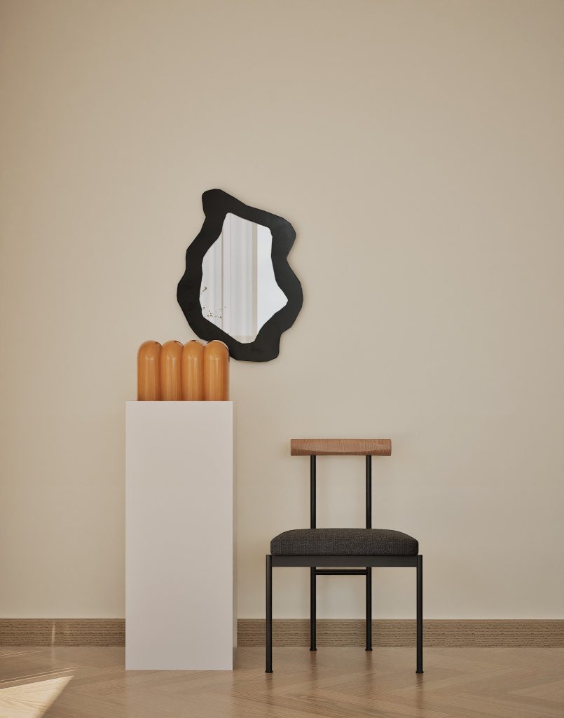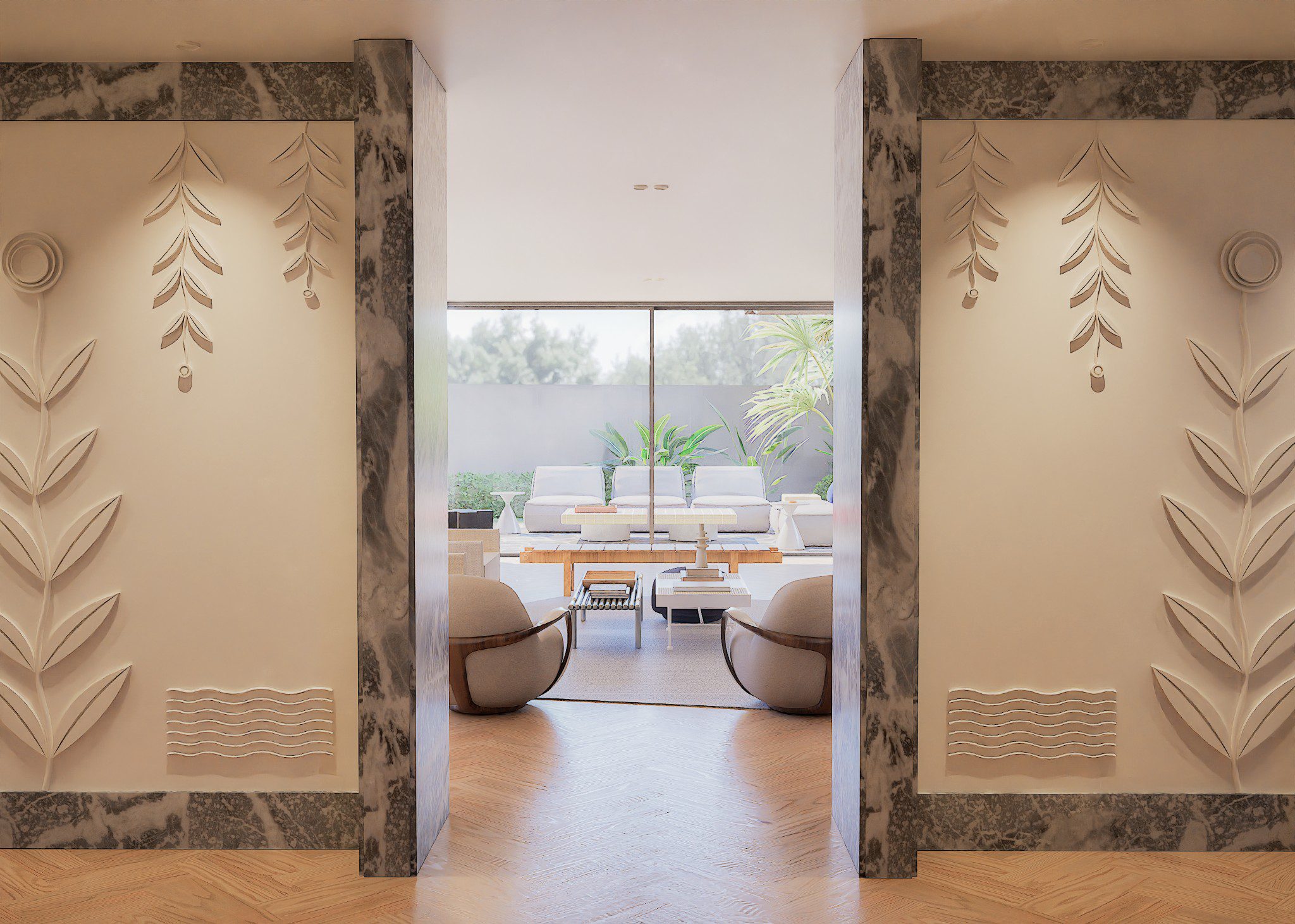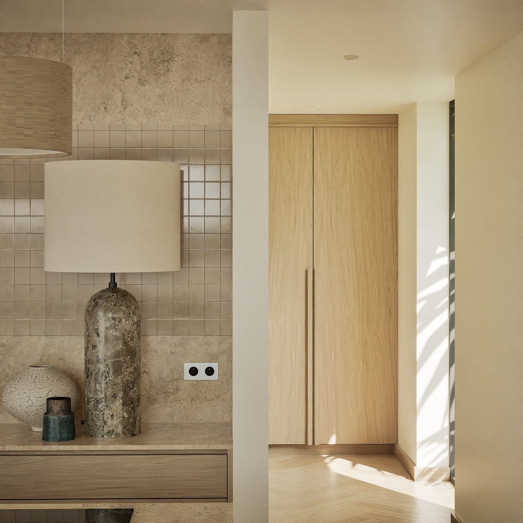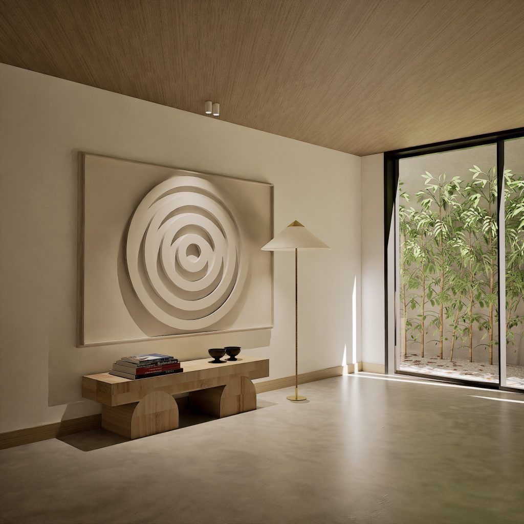 No Hall, o relevo mural em gesso retoma a ideia de arquitectura como arte aplicada. As pedras naturais e os volumes depurados constroem uma narrativa serena, onde cada detalhe prolonga a estrutura. O contraste entre materiais assegura permanência, não neutralidade.