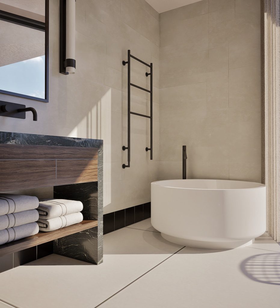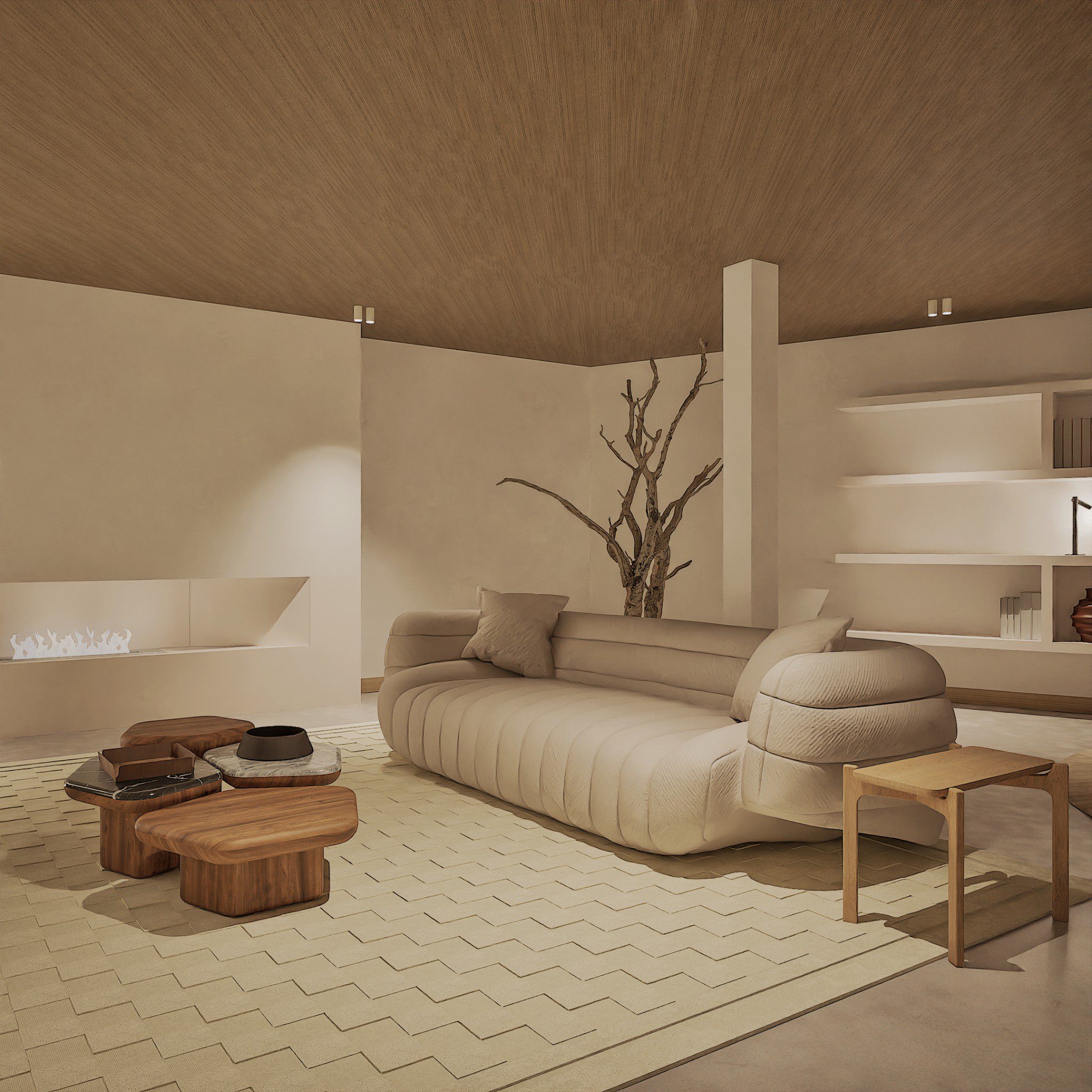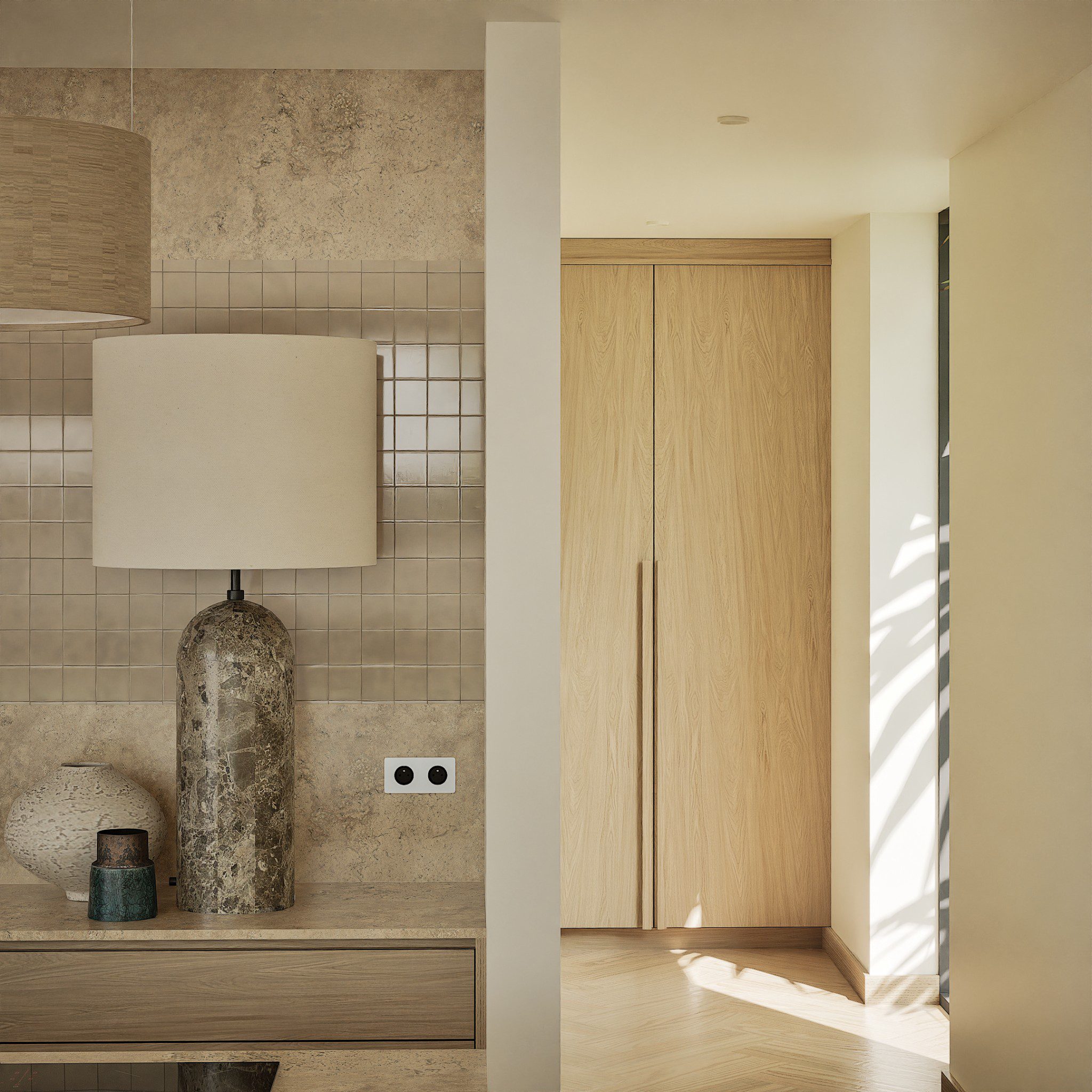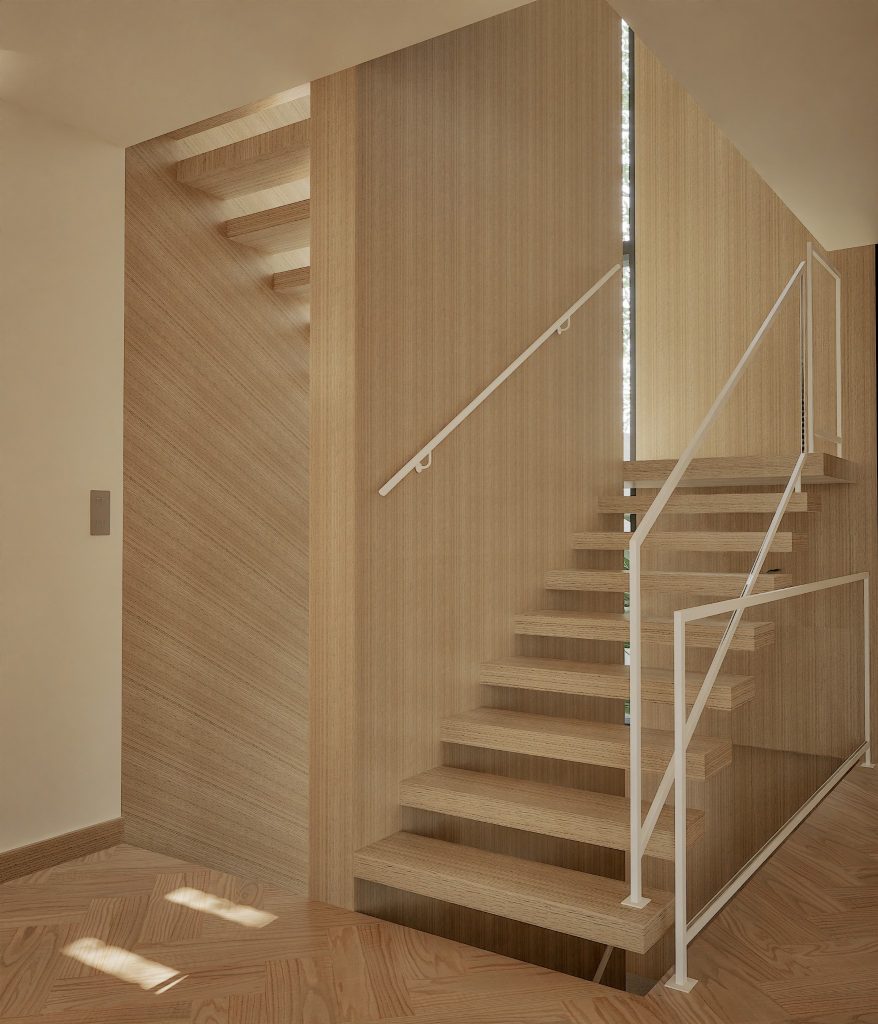 No Hall, o relevo mural em gesso retoma a ideia de arquitectura como arte aplicada. As pedras naturais e os volumes depurados constroem uma narrativa serena, onde cada detalhe prolonga a estrutura. O contraste entre materiais assegura permanência, não neutralidade.