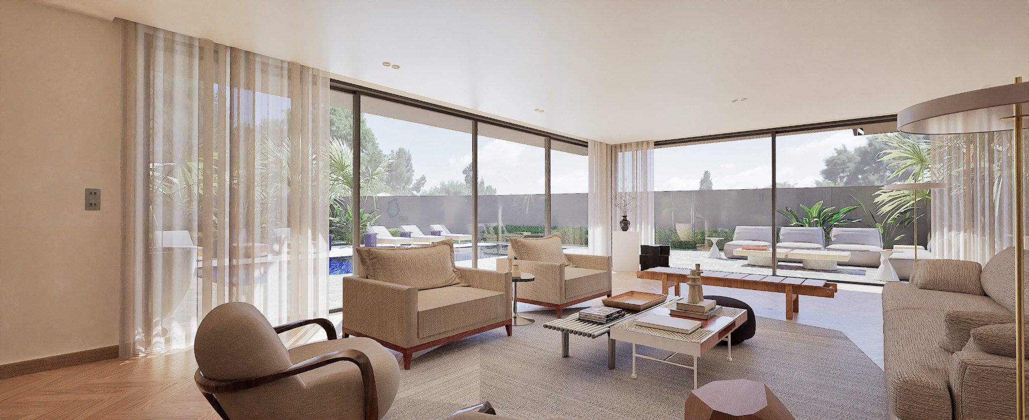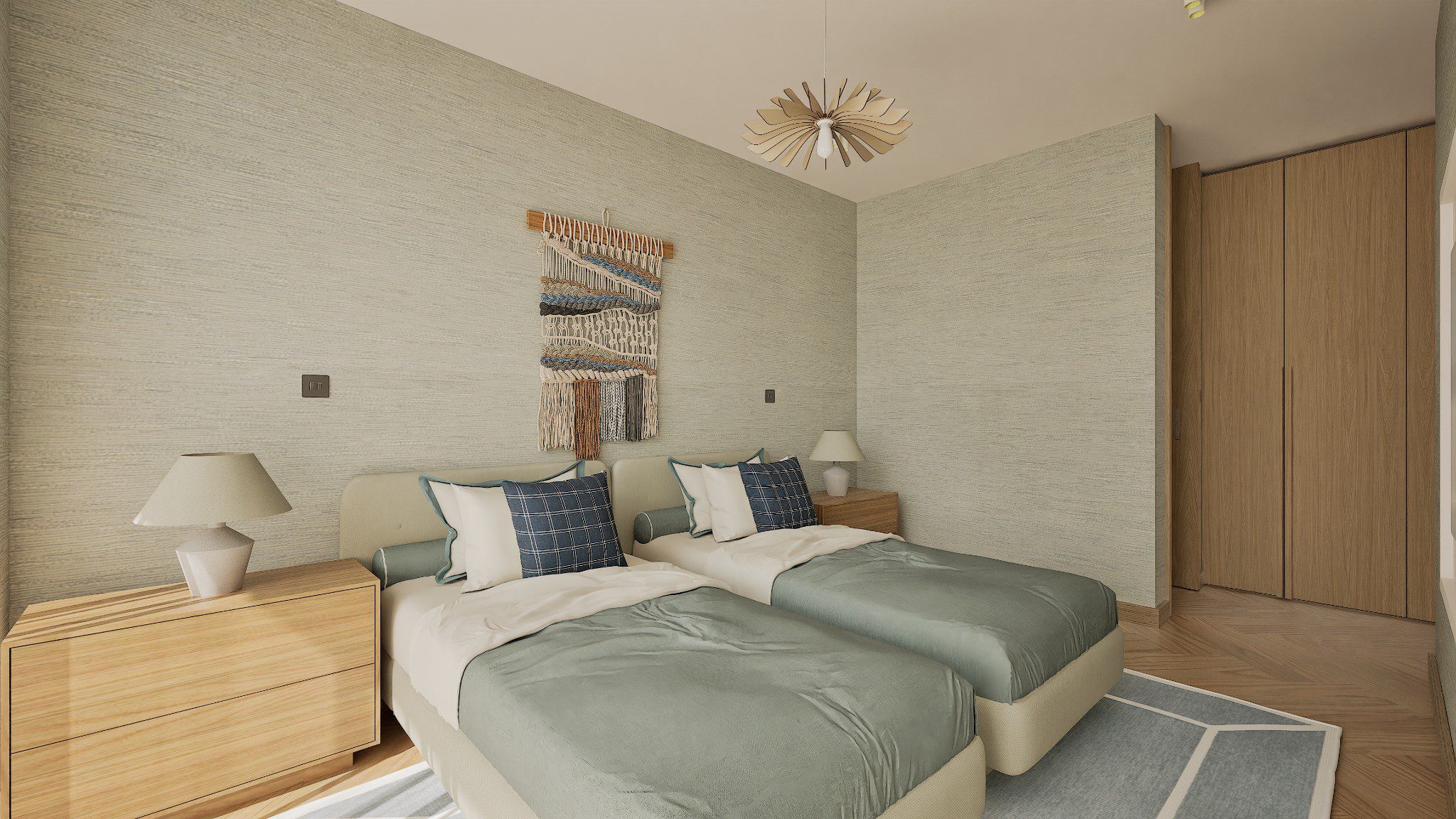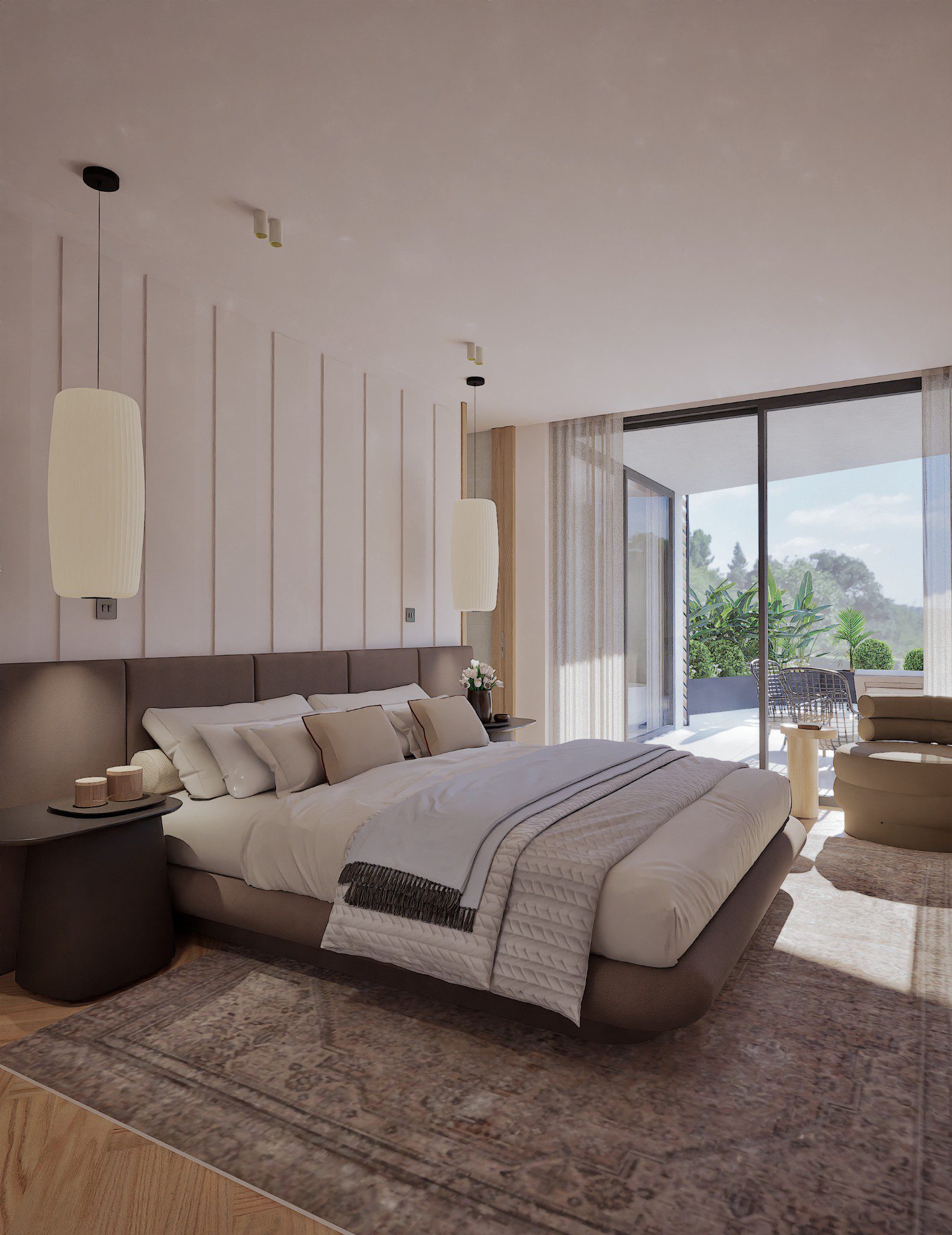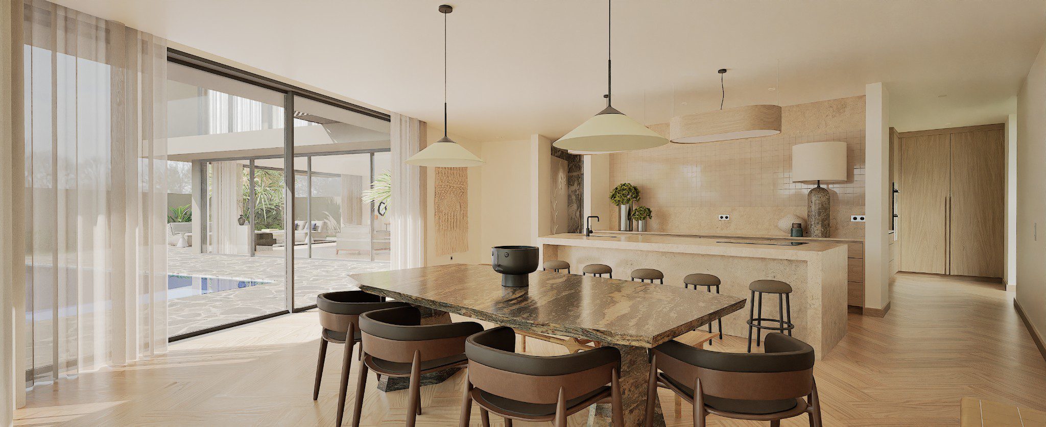 No Hall, o relevo mural em gesso retoma a ideia de arquitectura como arte aplicada. As pedras naturais e os volumes depurados constroem uma narrativa serena, onde cada detalhe prolonga a estrutura. O contraste entre materiais assegura permanência, não neutralidade.